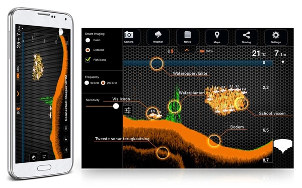 – Vis en bodemcontouren zichtbaar tot op 100 meter afstand (afhankelijk van OS en model smartphone)